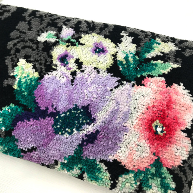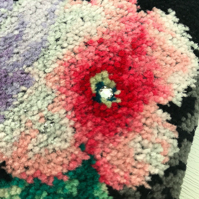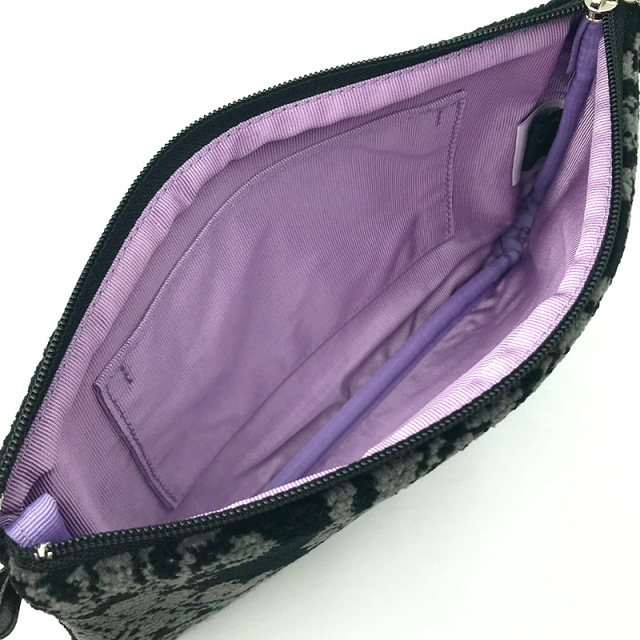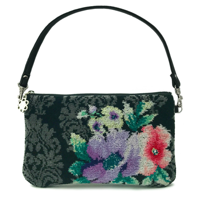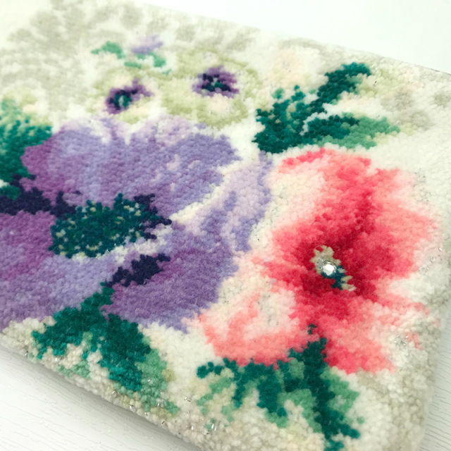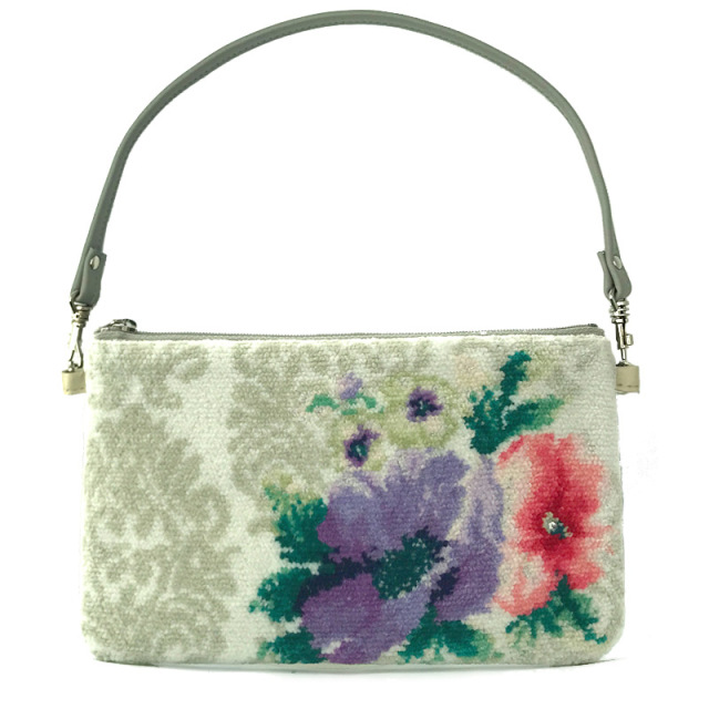 ピンクのお花の中心部にはスワロフスキーのラインストーンを1粒添えられたミニポーチの中でも贅沢なつくりのものに仕上がりました。